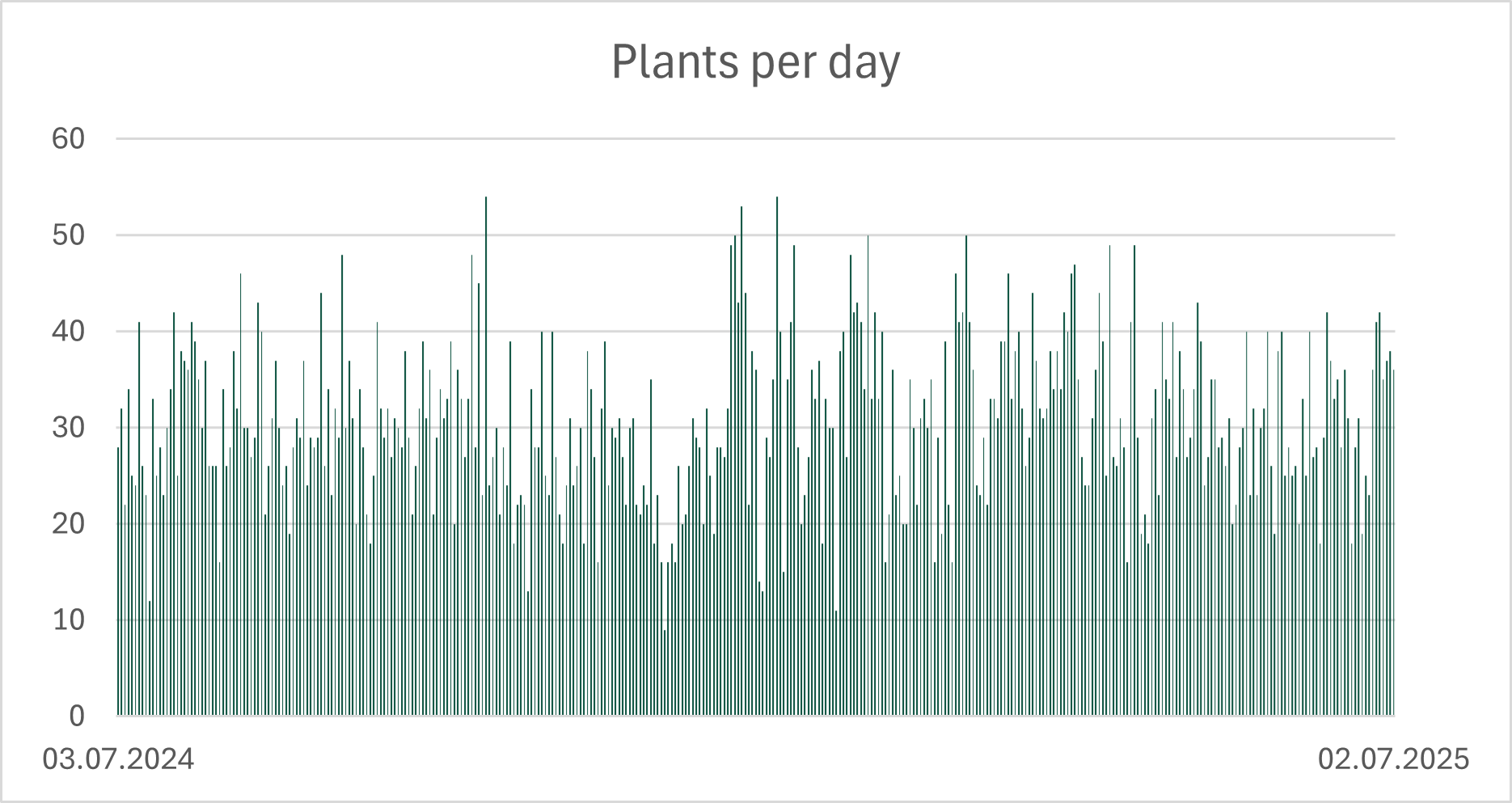 Together, these perspectives reveal a characteristic structural pattern: high daily variety combined with strong concentration. Many plants are present, but only a few appear again and again. This tension between diversity and dominance forms the analytical backdrop for all subsequent explorations of the data.
