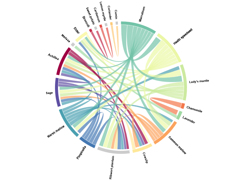 A clear cluster emerges among a group of medicinal plants: Marrubium, heath speedwell, lady’s mantle, common mallow, cowslip, ribwort plantain, pimpinella, marsh mallow, sage, and Achillea. These species are not simply frequent on their own; they are consumed together repeatedly, resulting in lift values far above what random co-occurrence would predict.
