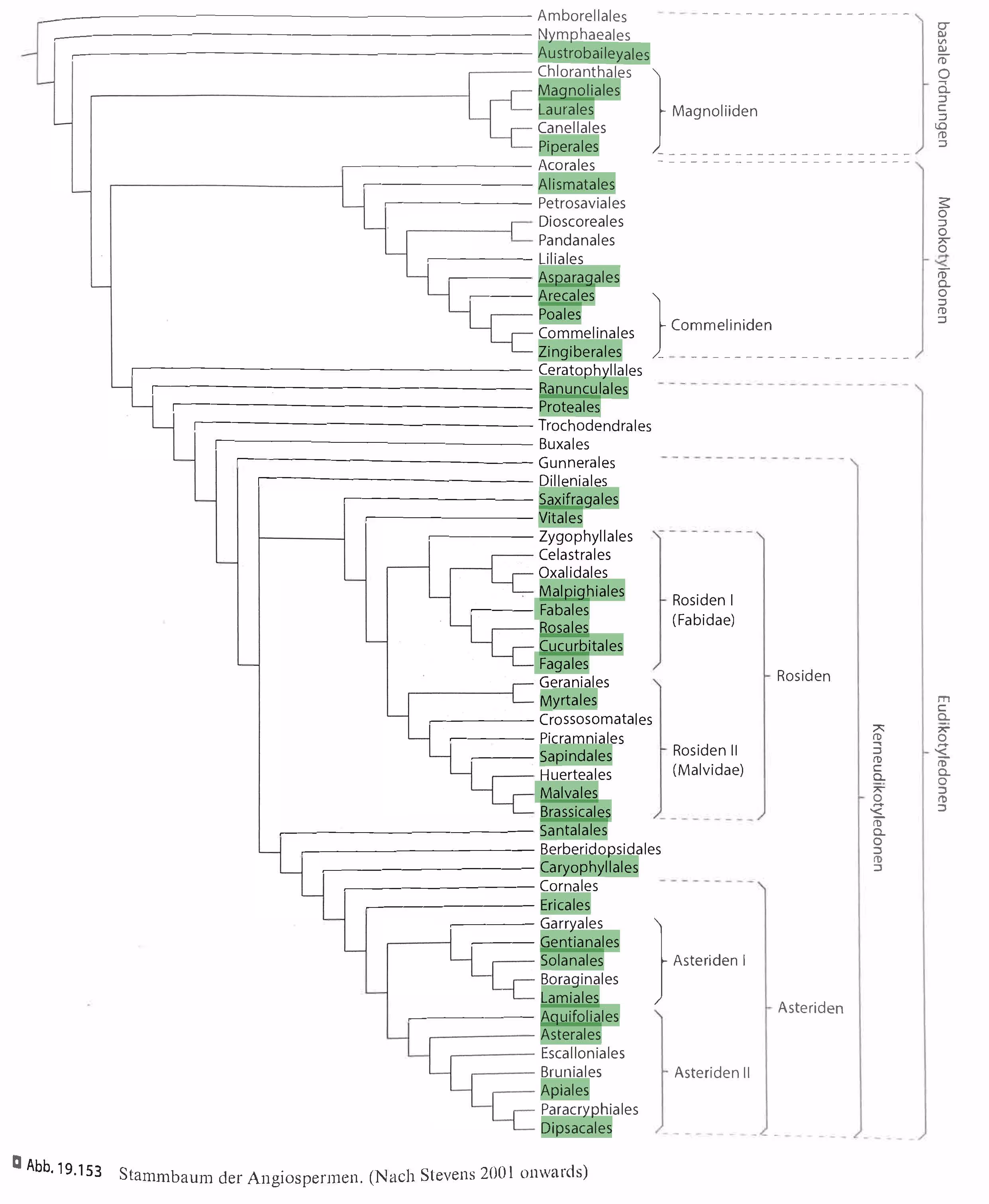 (Strasburger − Lehrbuch der Pflanzenwissenschaften; after Stevens, P. F. (2001 onwards). Angiosperm Phylogeny Website. Version 14, July 2017 [and more or less continuously updated since])